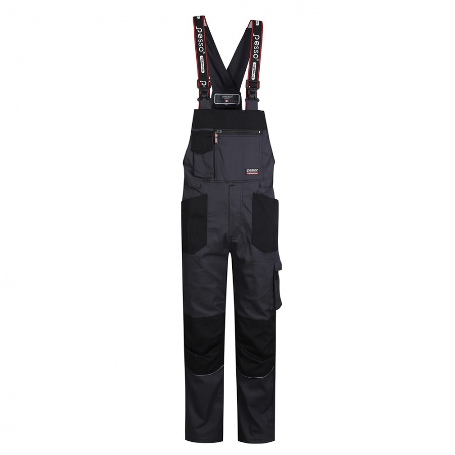 Darbinis puskombinezonis Pesso yra pasiūtas iš itin tvirto medvilninio STRETCH audinio su elastanu. Medvilninis tvilo audinys su 2 % minimaliu kiekiu elastano yra lengvas ir itin tamprus, kartu išlaikant audinio atsparumą plyšimui. Kelnių kišenės ir antkelių zonos yra iš itin tvirto RIP STOP audinio. Naujausių technologijų audiniai garantuoja judesių laisvę, komfortą ir oro cirkuliaciją.