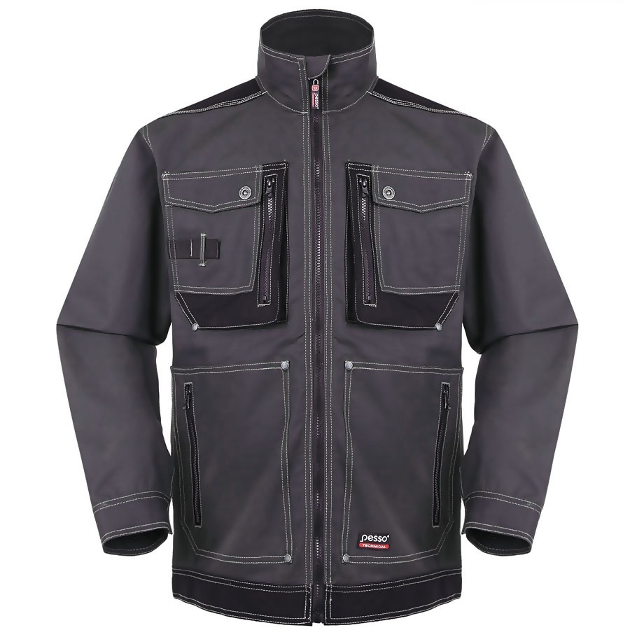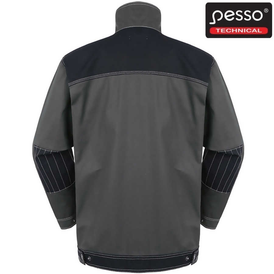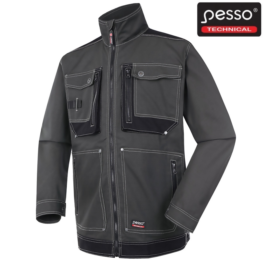 Darbinis švarkas Pesso pasiūtas iš itin tvirto medvilninio STRETCH audinio su 2 % minimaliu kiekiu elastano, kuris suteikia švarkui lengvumo, tamprumo ir atsparumo plyšimui. Švarko apykaklė iki pat viršaus užsegama užtrauktuku, o švarko apimtis apačioje reguliuojama spaudėmis. Visos pagrindinės siūlės prasiūtos triguba užlenkta siūle.Taip pat visos kišenės papildomai sutvirtintos sutankinta siūle. Papildoma audinio apsauga alkūnių srityje iš RIPSTOP audinio. Moderniausių technologijų audiniai garantuoja judesių laisvę, komfortą ir oro cirkuliaciją. Tai naujausias modelis su papildoma RIPSTOP audinio apsauga alkūnių srityje.