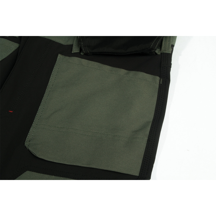 Antkeliai: Kelių srityje prisiūtos specialiai išformuotos kišenės įkišamiems antkeliams, išoriškai dviejuose aukščiuose sutvirtintos Cordura® audinio antsiuvais. 4-Way Stretch tamprus audinys nugaros dalyje.