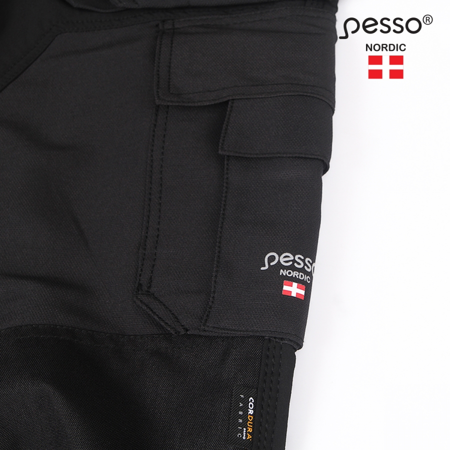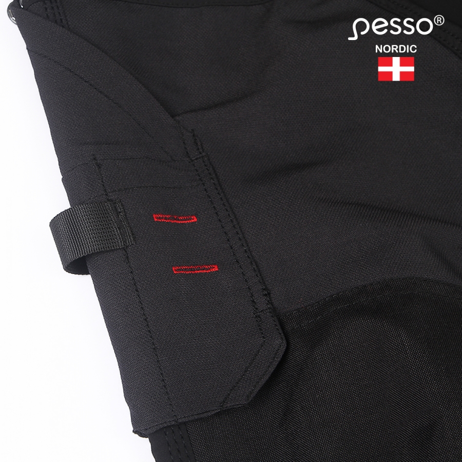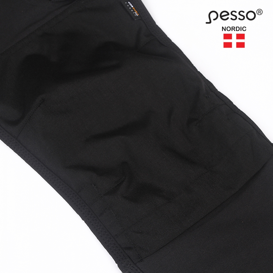 Antkeliai: Kelių srityje prisiūtos specialiai išformuotos kišenės įkišamiems antkeliams, išoriškai dviejuose aukščiuose sutvirtintos Cordura® audinio antsiuvais. 4-Way Stretch tamprus audinys nugaros dalyje.