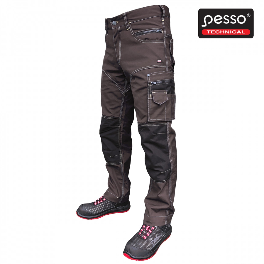 Darbo kelnės Pesso pasiūtos iš itin tvirto tvilo audinio. TWILL audinys išsiskiria savo plastiška struktūra, yra tankus dvipusis ruoželinis, sudarytas iš vidinio medvilnės sluoksnio ir poliesterio dėl tvirtumo, patvarumo. Šis audinys nesitraukia ir yra itin atsparus dėvėjimuisi, turi geras skalbimo savybes. Audinyje mažiau matosi nešvarumai dėl nelygaus išorinio pynimo. Džinsas taip pat yra Twill audinys. Darbo kelnės yra tvirtos, patogios, nevaržo judesių, turi specialius antsiuvus įkišamiems antkeliams. Funkcionalios kišenės: speciali kišenė telefonui, kišenė sėdynės dalyje, specializuota kišenė peiliui, užsegama kišenė ant dešinės klešnės su įmautėmis rašikliams. Du laikikliai plaktukams liemens srityje. Visos kišenės papildomai sutvirtintos sutankinta siūle, o pagrindinės siūlės prasiūtos triguba užlenkta siūle.