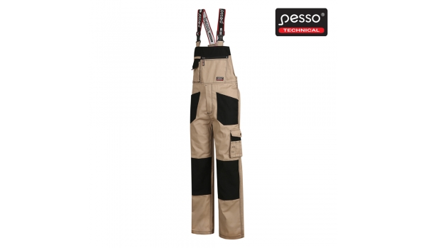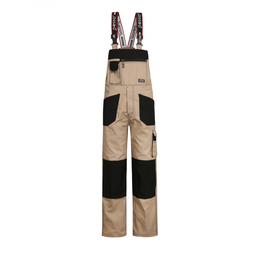 Darbo puskombinezonis Pesso pasiūtas iš itin tvirto tvilo audinio. TWILL audinys išsiskiria savo plastiška struktūra, yra tankus dvipusis ruoželinis, sudarytas iš vidinio medvilnės sluoksnio ir poliesterio dėl tvirtumo, patvarumo. Šis audinys nesitraukia ir yra itin atsparus dėvėjimuisi, gerai skalbiasi. Audinyje mažiau matosi nešvarumai dėl nelygaus išorinio pynimo. Puskombinezonis tvirtas, patogus, nevaržo judesių, turi specialius antsiuvus įkišamiems antkeliams. Funkcionalios kišenės: kišenė telefonui, kišenės krūtinės srityje, specialios įmautės rašikliams, kišenė sėdynės dalyje, specializuota kišenė peiliui, užsegama kišenė ant dešinės klešnės. Lengva nusistatyti reikiamą dydį su reguliuojamo ilgio petnešomis ir tamprios gumos įsiūvu nugaros srityje.