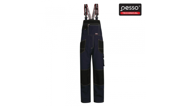 Darbo puskombinezonis Pesso pasiūtas iš itin tvirto tvilo audinio. TWILL audinys išsiskiria savo plastiška struktūra, yra tankus dvipusis ruoželinis, sudarytas iš vidinio medvilnės sluoksnio ir poliesterio dėl tvirtumo, patvarumo. Šis audinys nesitraukia ir yra itin atsparus dėvėjimuisi, gerai skalbiasi. Audinyje mažiau matosi nešvarumai dėl nelygaus išorinio pynimo. Puskombinezonis tvirtas, patogus, nevaržo judesių, turi specialius antsiuvus įkišamiems antkeliams. Funkcionalios kišenės: kišenė telefonui, kišenės krūtinės srityje, specialios įmautės rašikliams, kišenė sėdynės dalyje, specializuota kišenė peiliui, užsegama kišenė ant dešinės klešnės. Lengva nusistatyti reikiamą dydį su reguliuojamo ilgio petnešomis ir tamprios gumos įsiūvu nugaros srityje.