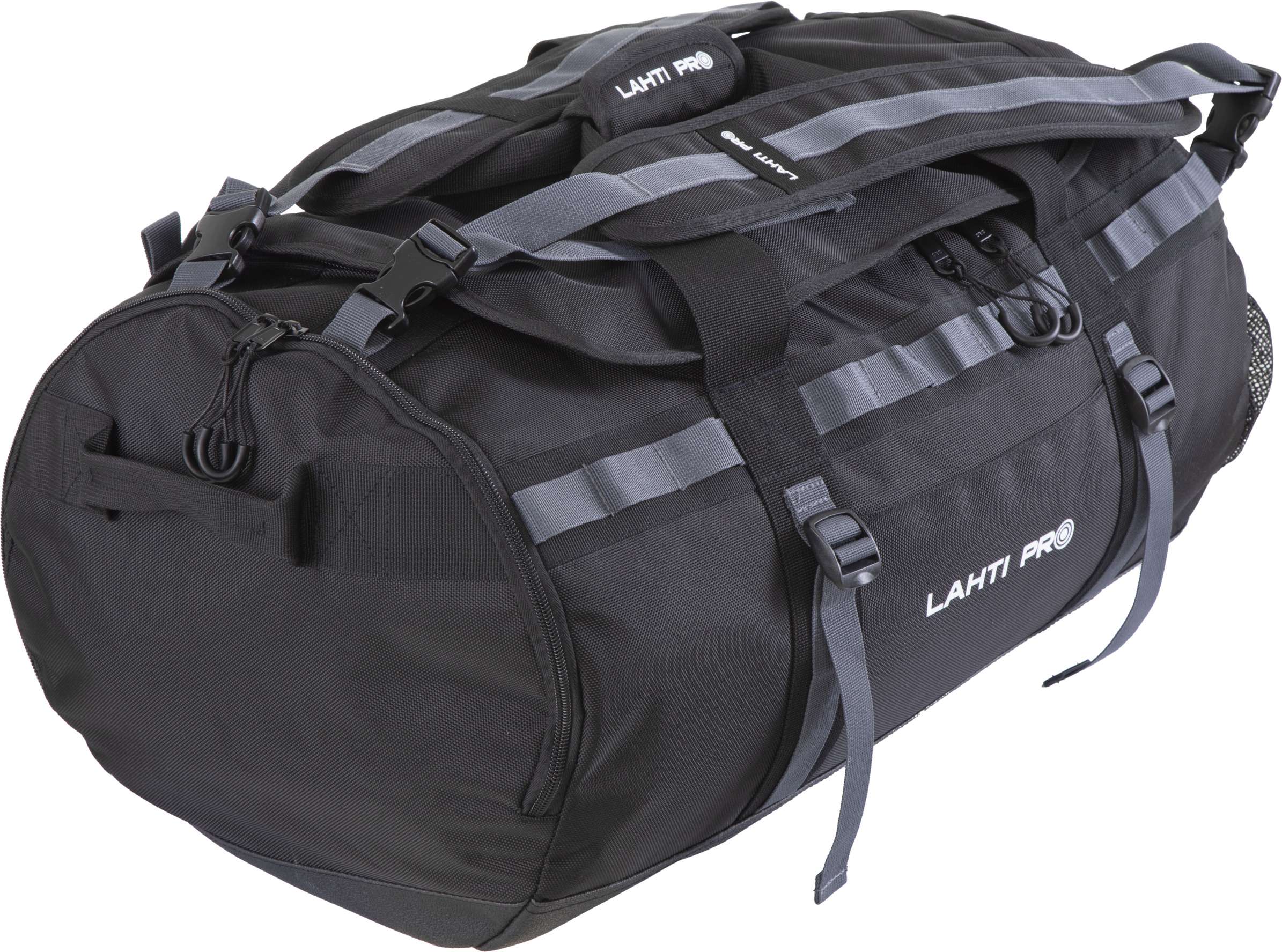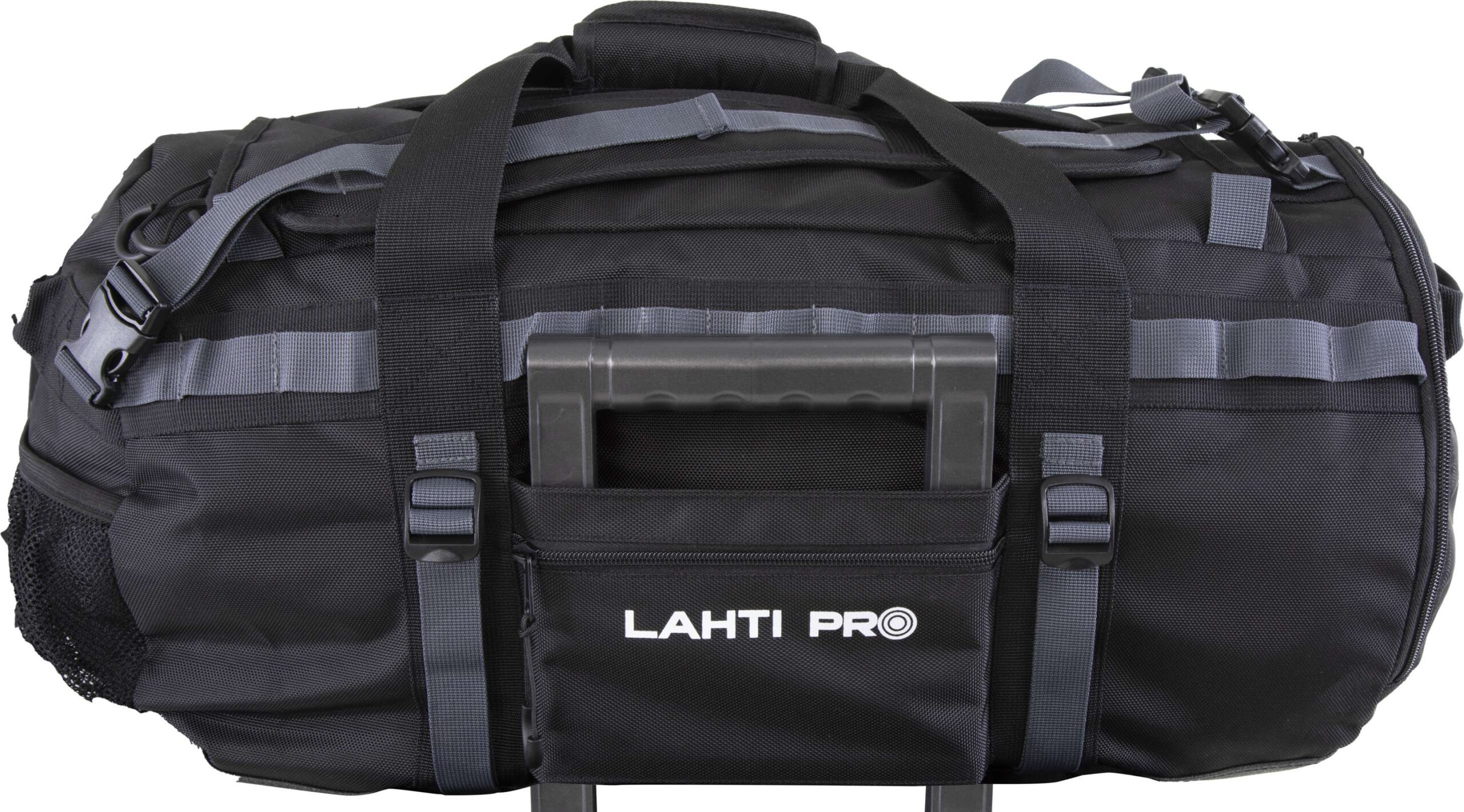 Dviejų funkcijų drabužių krepšys juodas 53L Lahti Pro. Aukštos kokybės 53 litrų talpos krepšys, pagamintas iš vandeniui atsparios, patvarios ir pažeidimams atsparios Oxford 1680D medžiagos.Turi funkcinį batų skyrių, krepšio dugnas pagamintas iš trinčiai atsparios medžiagos. Pagrindinis skyrius užsegamas užtrauktuku, kurį galima užsegti pakabinama spyna. Taip pat galite pritvirtinti prie lagamino teleskopų per specialią šoninę kišenę. Dvi papildomos tinklinės kišenės gali lengvai sutalpinti du vandens butelius. Krepšyje taip pat yra papildoma vidinė kišenė su specialiu raktų laikikliu. Išskirtinis šio krepšio bruožas yra tas, kad jis gali būti naudojamas ir kaip kuprinė, o jame yra reguliuojami pečių dirželiai. Taip pat turime tam skirtą skyrių avalynei nešioti – nebereikia jaudintis, kad išsipurvinsime daiktus.
